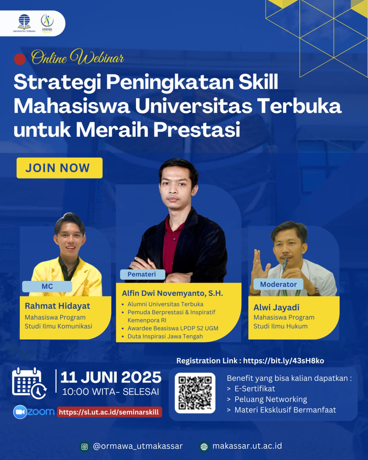 STARNEWSID.COM, MAKASSAR – Dalam rangka mendukung pengembangan kompetensi dan peningkatan prestasi mahasiswa, Bidang Keilmuan Organisasi Mahasiswa (ORMAWA) Universitas Terbuka (UT) Makassar akan menyelenggarakan webinar bertajuk “Strategi Peningkatan Skill Mahasiswa Universitas Terbuka untuk Meraih Prestasi” Minggu, (8,6/2025).