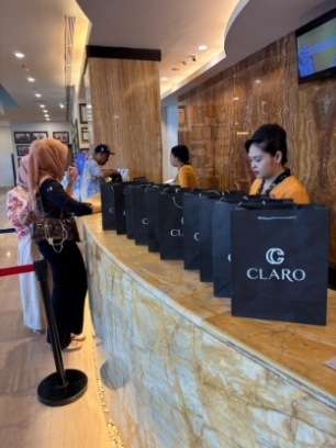 General Manager Hotel Claro Makassar, Anggiat Sinaga, secara langsung menyerahkan souvenir sebagai bentuk terima kasih atas kepercayaan tamu yang senantiasa memilih Claro Makassar sebagai destinasi menginap dan bersantap.