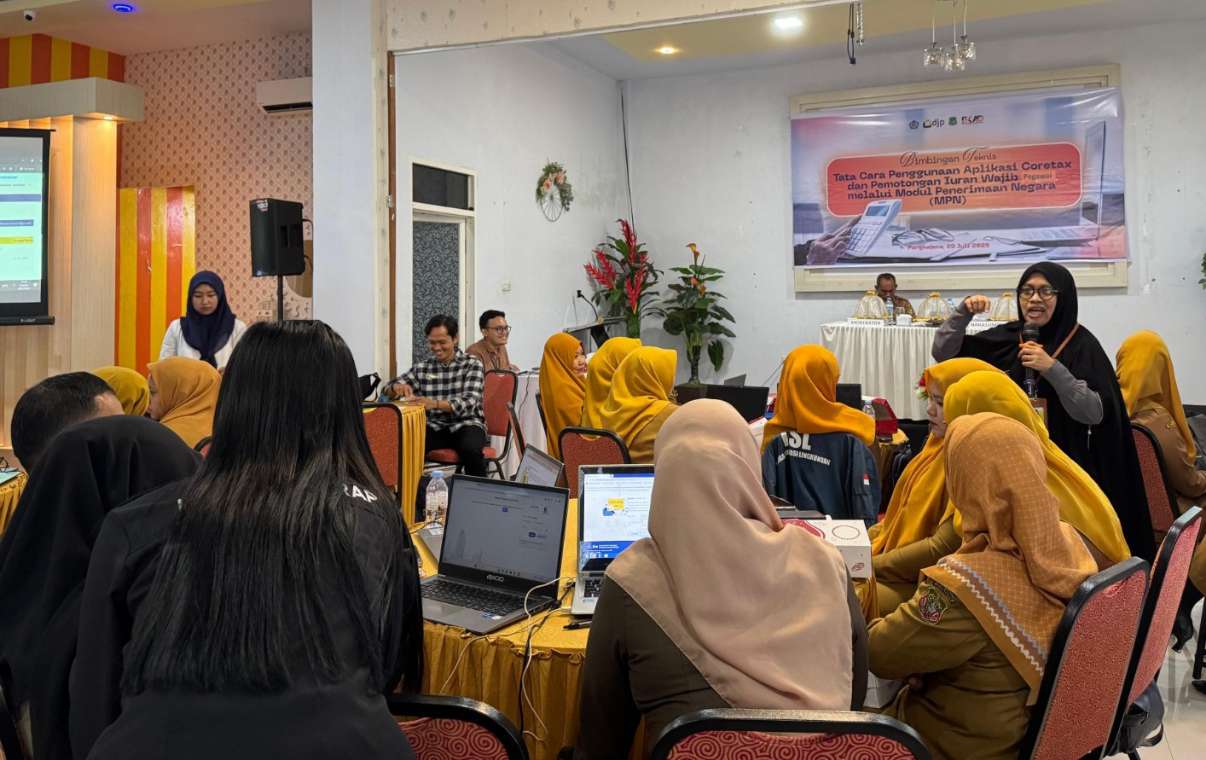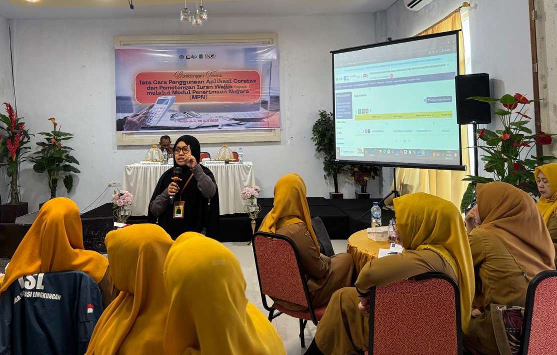 “Sepanjang tahun 2025, tidak jarang kami temukan adanya perbedaan pandangan antar bendahara terkait pemotongan pajak melalui aplikasi Coretax. Untuk mengatasi hal tersebut, kami mengajukan permintaan bimtek ke KPP Parepare agar para bendahara mendapat pemahaman yang seragam,” Materi bimtek disampaikan oleh penyuluh pajak dari KPP Pratama Parepare, Jumiaty dan Muhammad Abid Fauzan Y.