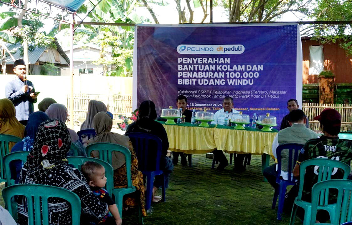 STARNEWSID.COM, MAKASSAR—PT Pelabuhan Indonesia (Persero) atau Pelindo Regional 4 Makassar menyalurkan bantuan Tanggung Jawab Sosial dan Lingkungan (TJSL) untuk pengembangan budidaya udang windu di Desa Lakkang, Kecamatan Tallo, Kota Makassar, sebagai upaya mendorong kemandirian ekonomi masyarakat pesisir.