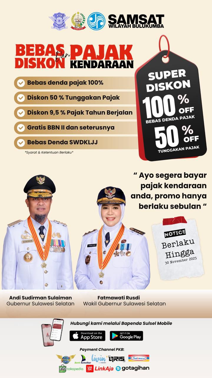 “Alhamdulillah super diskon pajak kendaraan diperpanjang sampai 30 November 2025. Ini bukti keberpihakan Pemprov Sulsel ke masyarakat,” ungkap Kepala UPT Badan Pendapatan Wilayah Bulukumba, Rudy Ramlan, Sabtu 1 November 2025.
