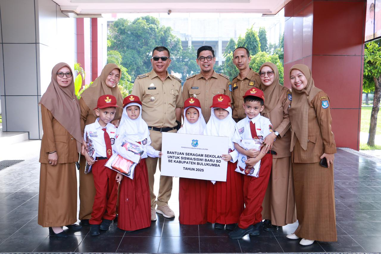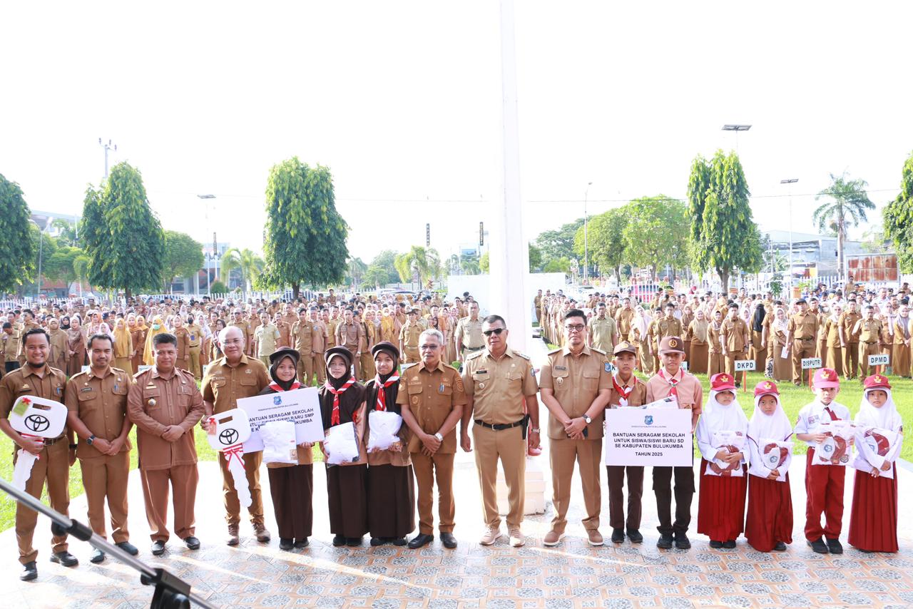 Pembagian seragam sekolah gratis ini diserahkan secara simbolis oleh Bupati Bulukumba Andi Muchtar Ali Yusuf di sela Apel Gabungan OPD di Kantor Bupati Bulukumba, Senin 14 Mei 2025.