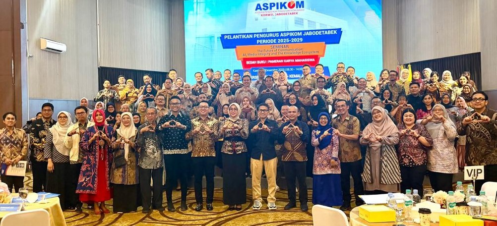 Kamis kemarin di Kebon Jeruk, Aspikom Korwil Jabodetabek bikin gawean di Kemala Ballroom Kampus Universitas Esa Unggul. Ketuanya berganti dari Bu Rini ke Bu Erna, dekan sekaligus atasan saya di Fakultas Ilmu Komunikasi. Ia dilantik Prof Anang Sujoko, Ketum DPP Aspikom. Seratus lebih dosen disahkan sebagai pengurus asosiasi yang berlatar disiplin ilmu komunikasi. Penyerahan bendera organisasi dari Prof Anang ke Bu Erna menandai awal mula kerja pengurus baru hingga 2029.
